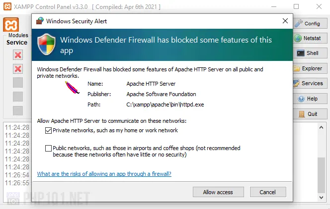 On the first run, Windows Firewall will ask for your permission to allow network access to XAMPP’s Apache Webserver. Normally it’s safe to do so in Private networks, which is only accessible on your trusted networks.