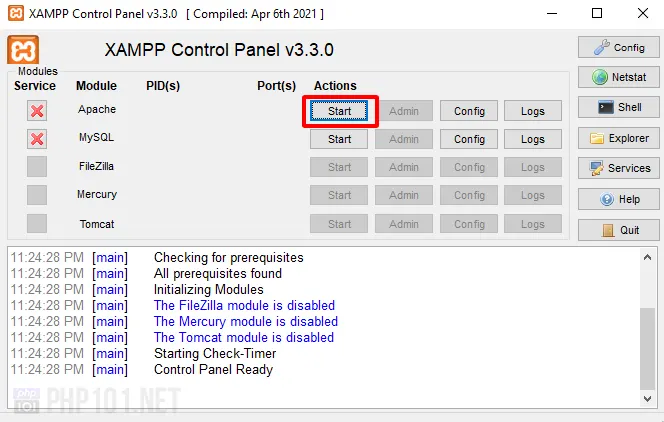 On the XAMPP Control panel, click Start on the Apache module row, which will start the Apache Webserver.