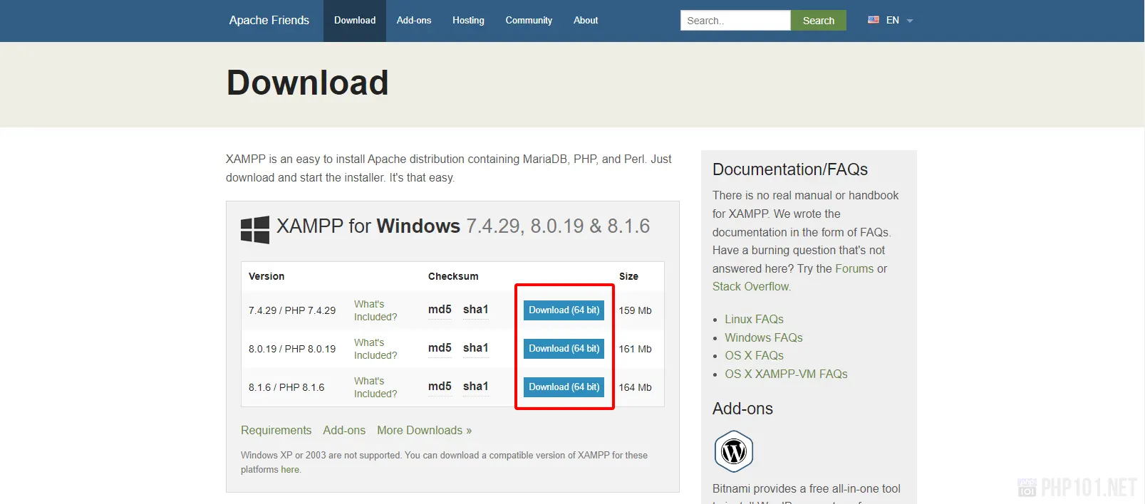 First, we will have to download XAMPP with the PHP version we wanted. Navigate to official XAMPP download website: