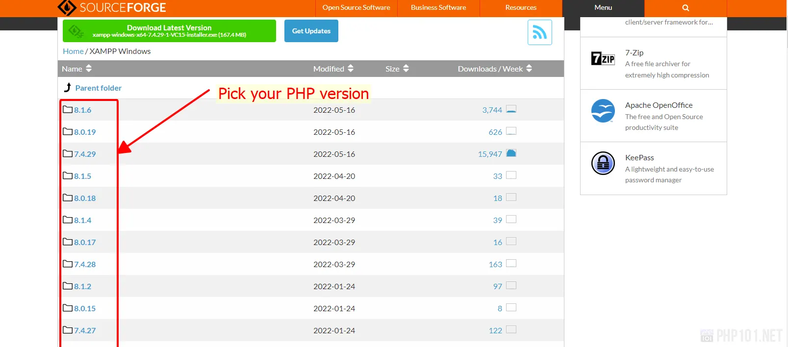 On the XAMPP Windows version browsing page, pick a PHP version that you want to have XAMPP bundled with.